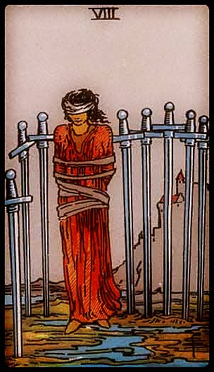 A.E. Waite (1911): A hoodwinked female figure balances two swords upon her shoulders. Divinatory Meanings: Conformity and the equipoise which it suggests, courage, friendship, concord in a state of arms; another reading gives tenderness, affection, intimacy. The suggestion of harmony and other favourable readings must be considered in a qualified manner, as Swords generally are not symbolical of beneficent forces in human affairs. Gifts for a lady, influential protection for a man in search of help. Reversed: Imposture, falsehood, duplicity, disloyalty. Dealings with rogues.