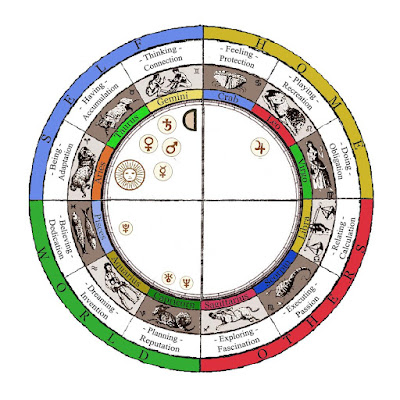 This quarter relates to Relations outside the close circle of family and friends. Aquintances, partners, collegaues, co-workers - people and events we encounter pursuing love - be it a person or what brings us fun. This a a qurter that forms opinions, and a person needs a lot of different social backgrounds and experiences if there is a lot of planets here. He or she may lose oneself in helping others, forgeting about one's own well-being, for example.